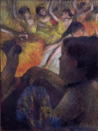 Sur toute sa carrière, de ses débuts dans les années 1860 jusqu’à ses oeuvres ultimes au-delà de 1900, Degas a fait de l’Opéra le point central de ses travaux, sa « chambre à lui ». Il en explore les divers espaces – salle et scène, loges, foyer, salle de danse -, s’attache à ceux qui les peuplent, danseuses, chanteurs, musiciens de l’orchestre, spectateurs, abonnés en habit noir hantant les coulisses. Cet univers clos est un microcosme aux infinies possibilités et permet toutes les expérimentations : multiplicité des points de vue, contraste des éclairages, étude du mouvement et de la vérité du geste.